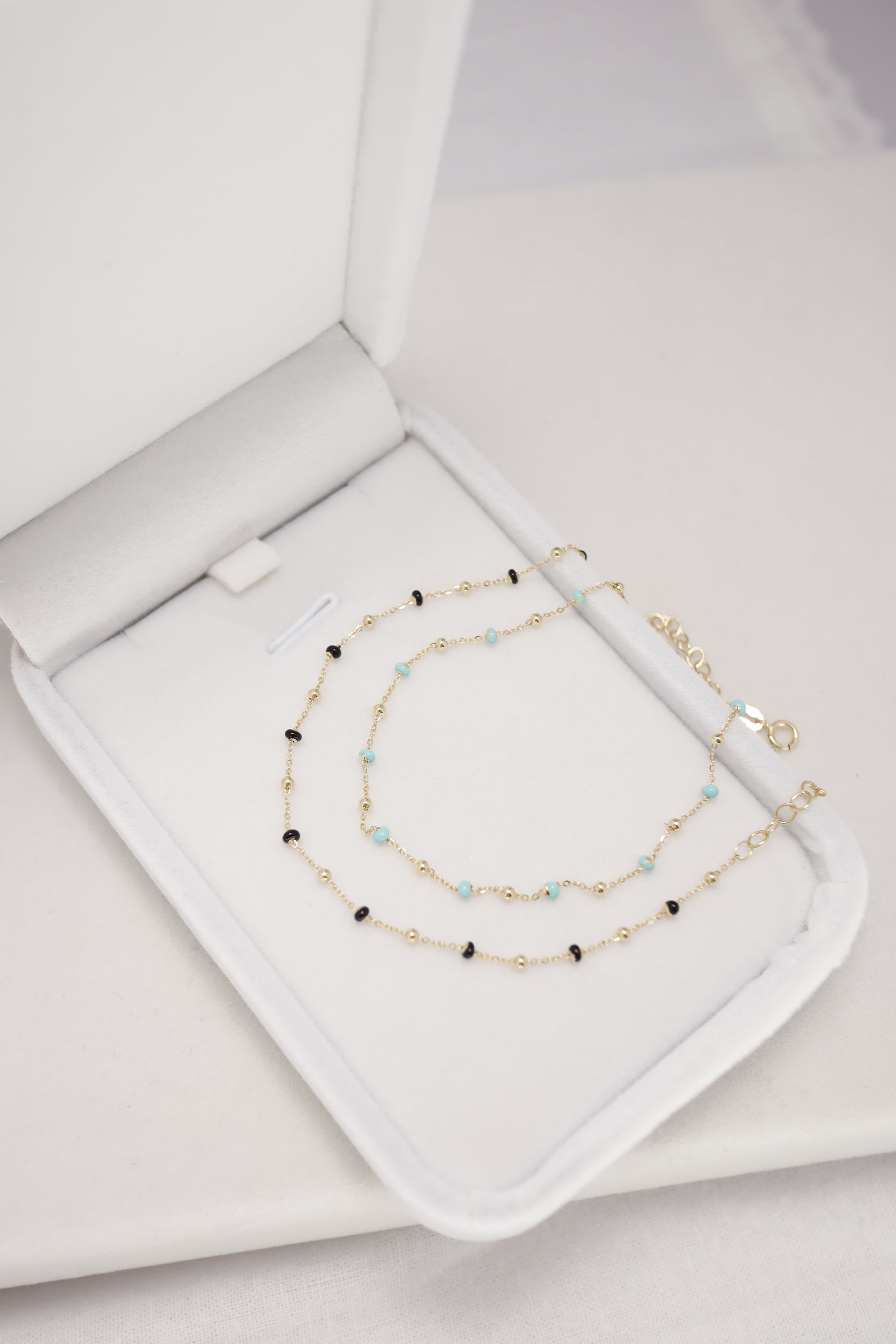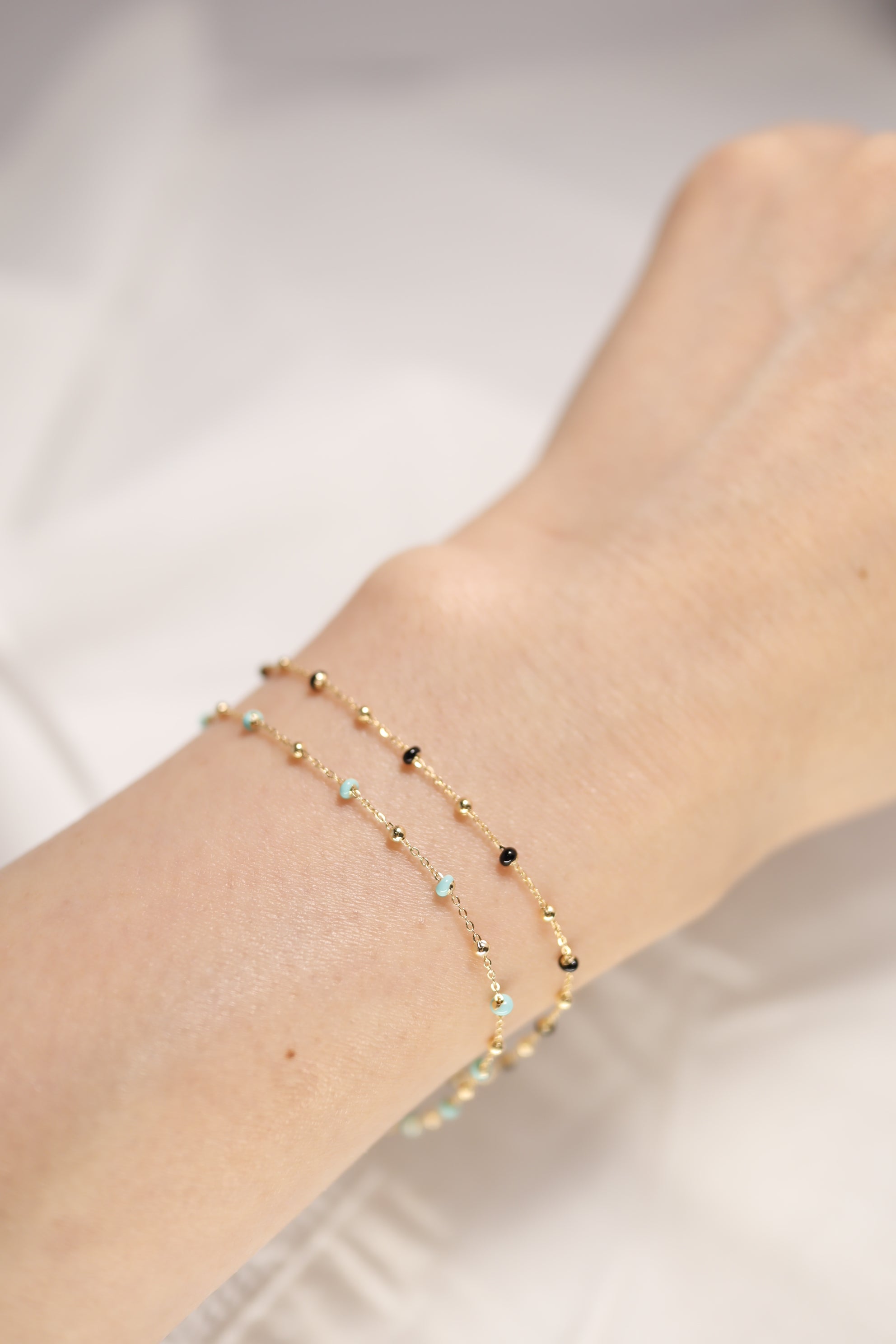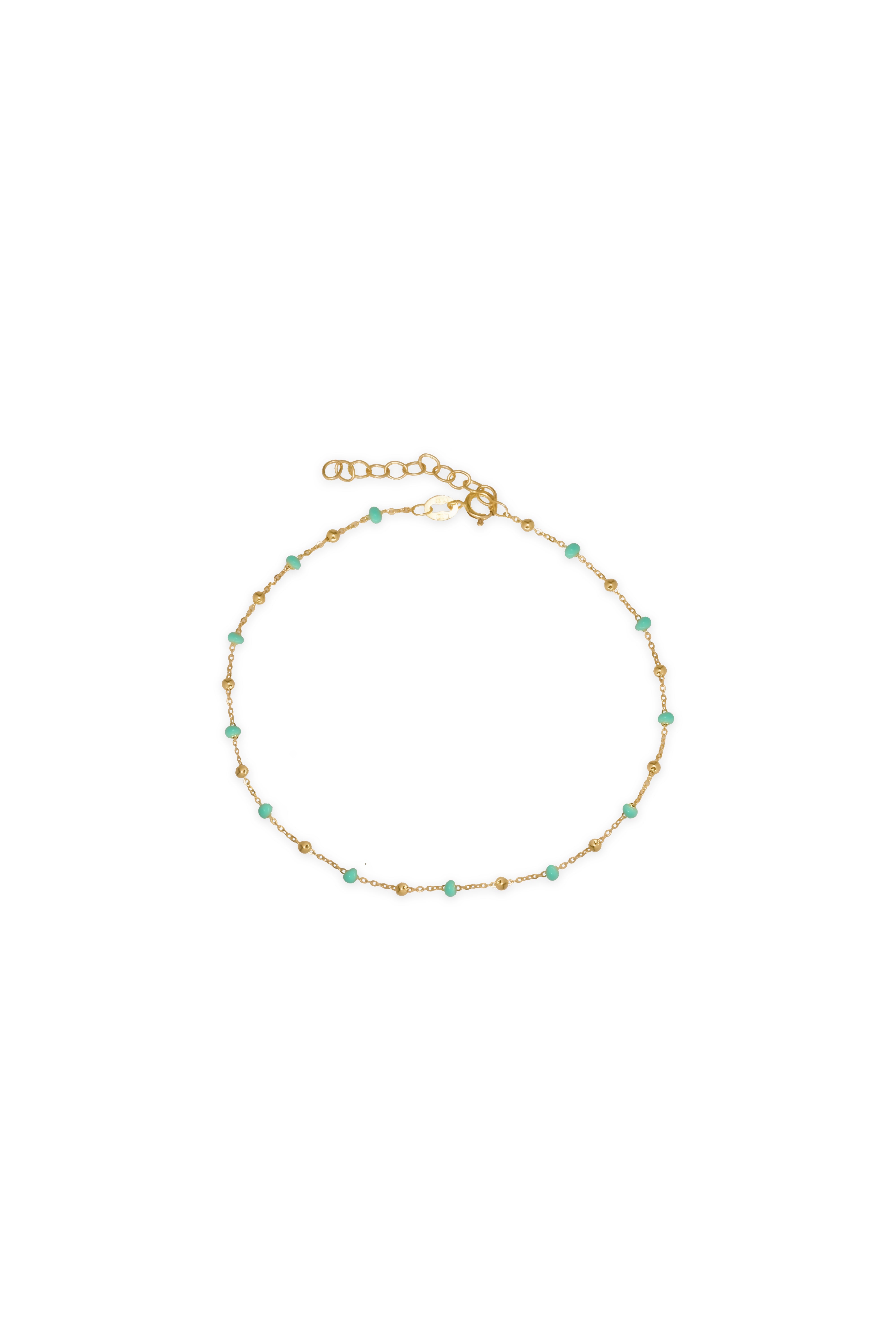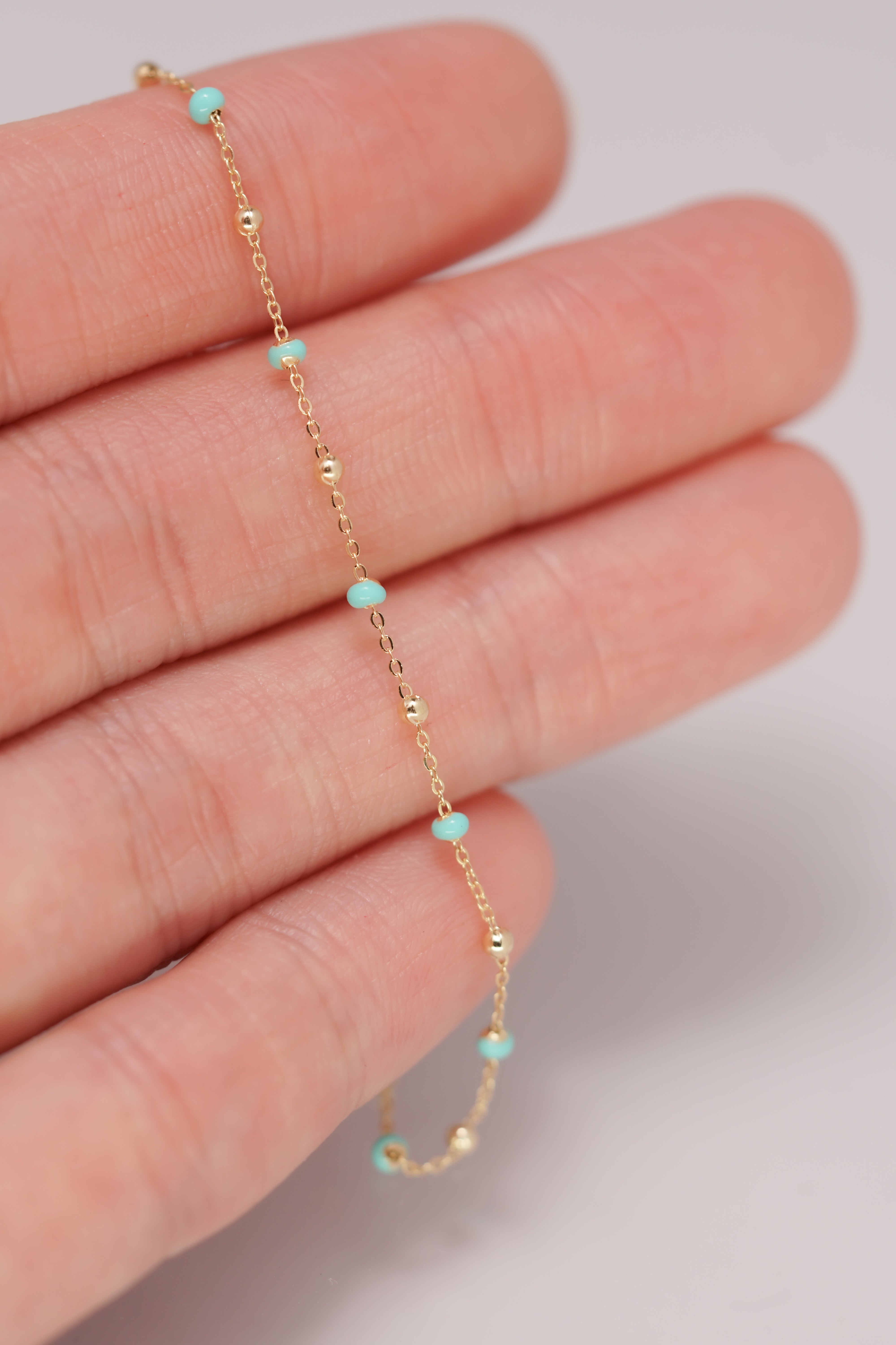nfuse your style with a touch of vibrant elegance with the 14K Gold Mint Turquoise Blue Epoxy Beads Ball Chain Linked Bracelet. This beautiful bracelet features a delicate 14K gold chain adorned with mint turquoise blue epoxy beads, creating a fresh and eye-catching contrast. The smooth epoxy beads add a modern twist to the classic gold chain, making this bracelet perfect for both casual wear and special occasions. Lightweight and comfortable, it’s ideal for layering or wearing alone as a statement piece that adds a pop of color to any outfit.
