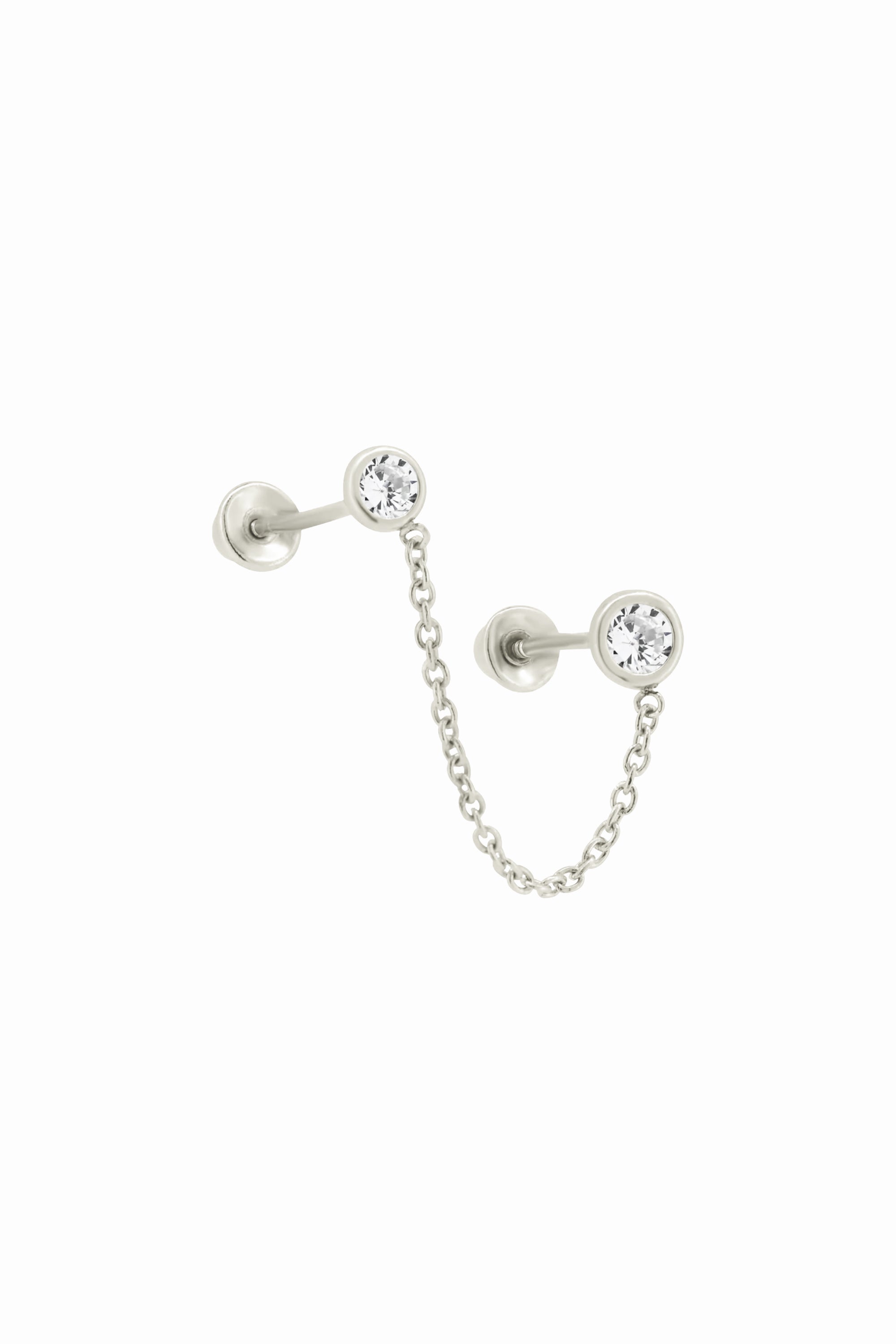 Elevate your jewelry collection with the 14K Solid Gold 2 Bezel Studs Chain Linked Screw Back Earring, a unique and sophisticated piece that blends minimalism with modern elegance. Featuring two bezel-set studs connected by a delicate solid gold chain, this earring is perfect for double piercings, creating an effortless layered look without additional jewelry.