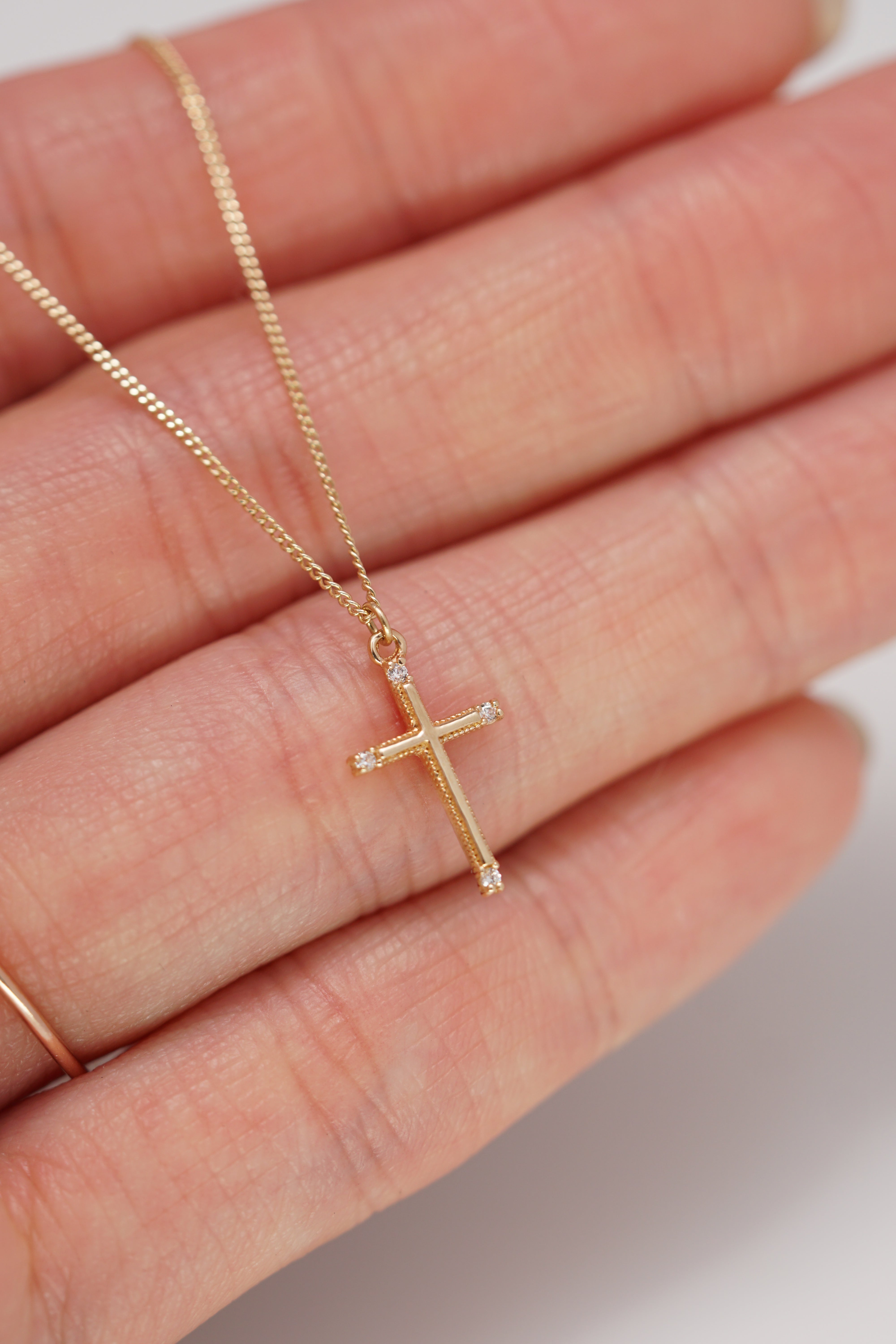 Celebrate faith and elegance with our 14K solid gold diamond-accented cross necklace, crafted in Korea with meticulous attention to detail. Featuring a classic cross design enhanced with shimmering diamond accents, this necklace is the perfect blend of sophistication and spirituality. Its timeless design makes it a versatile piece, suitable for both everyday wear and special occasions.