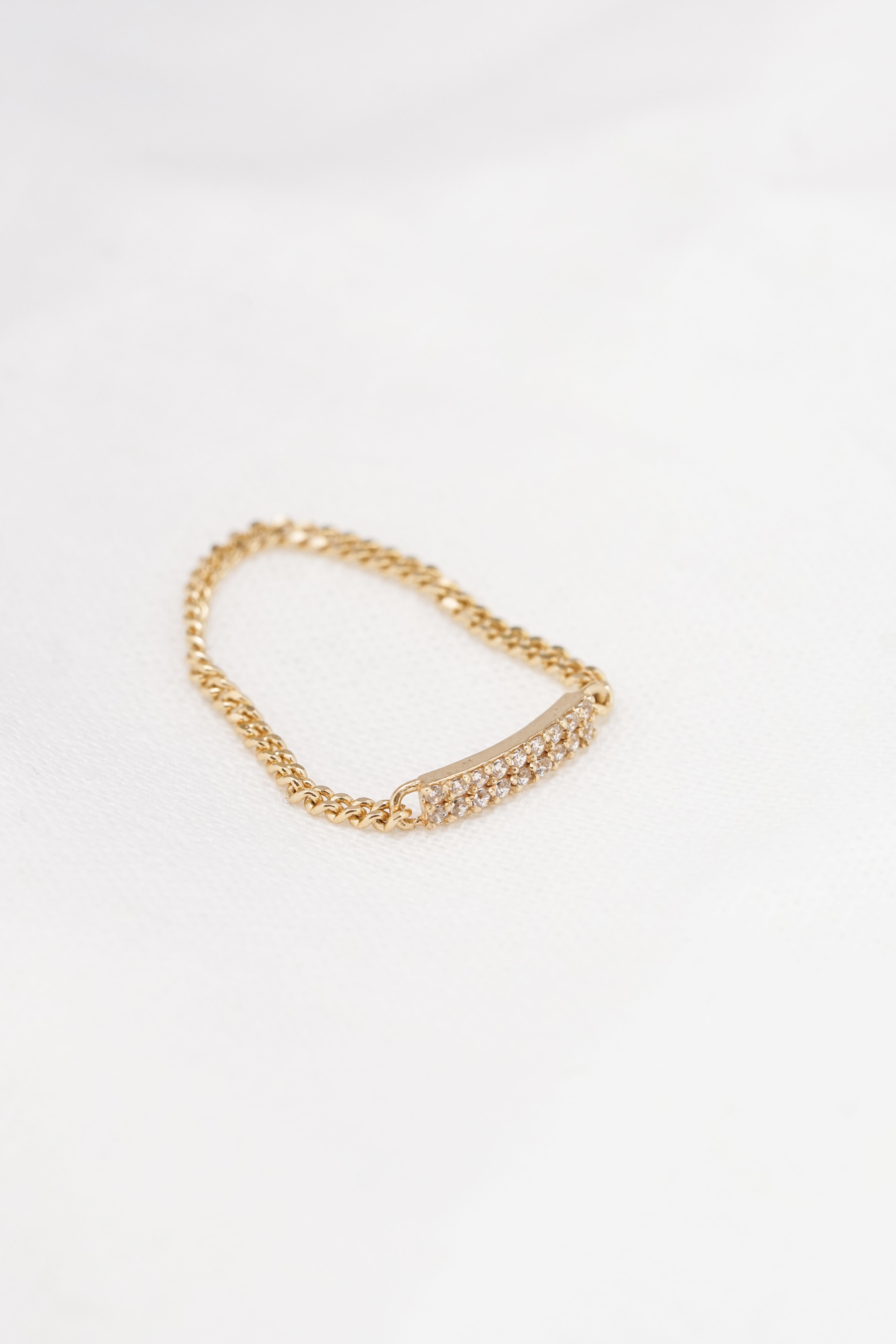 Add a touch of sparkle to your look with our 14K solid gold pavé bar chain ring. This unique design combines the elegance of a gold pavé bar with the flexibility of a delicate chain band, creating a lightweight and comfortable accessory that stands out. Perfect for layering or wearing alone, this ring is a must-have for those who love sophisticated yet playful jewelry.