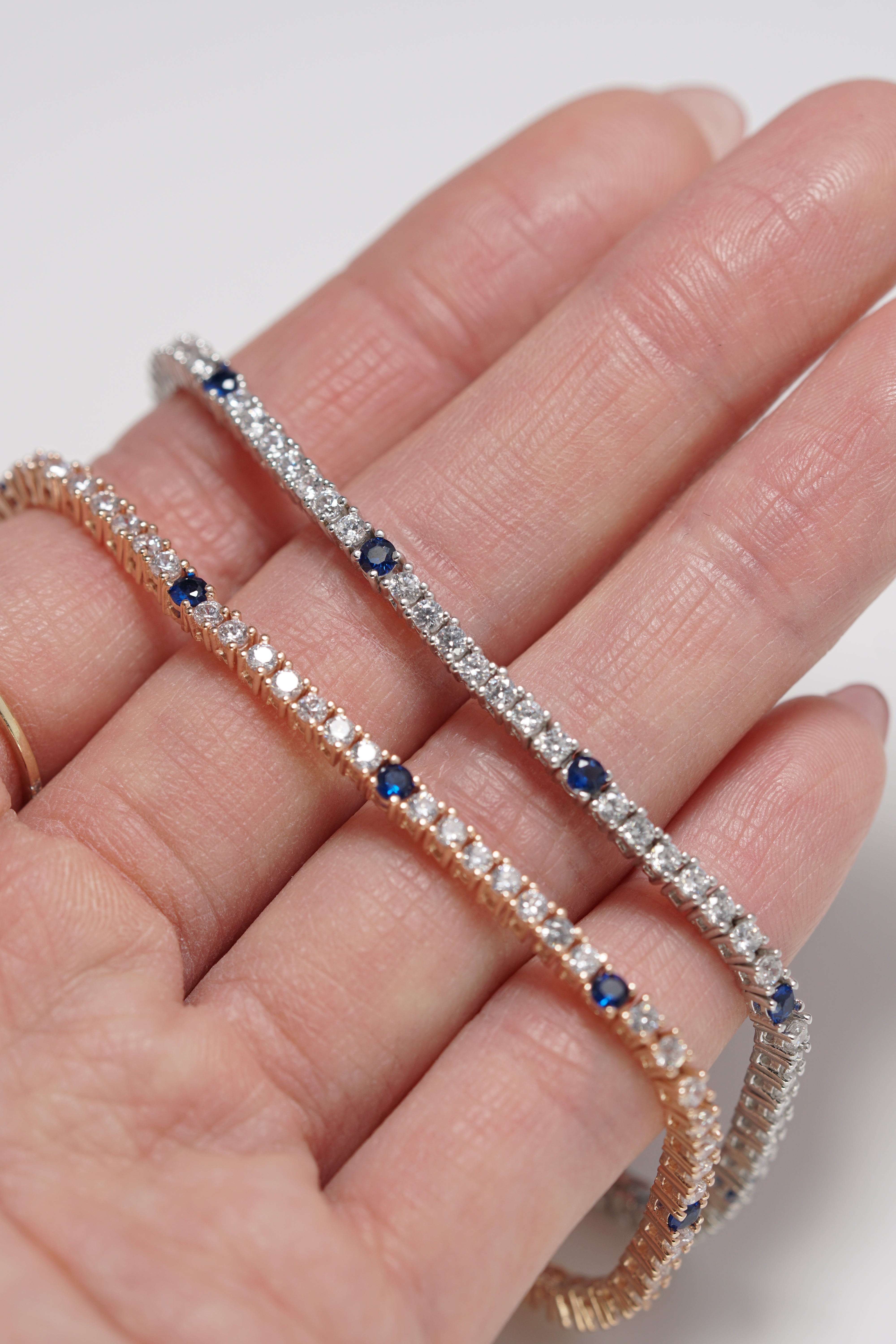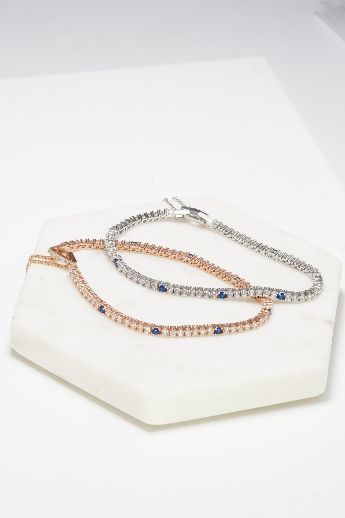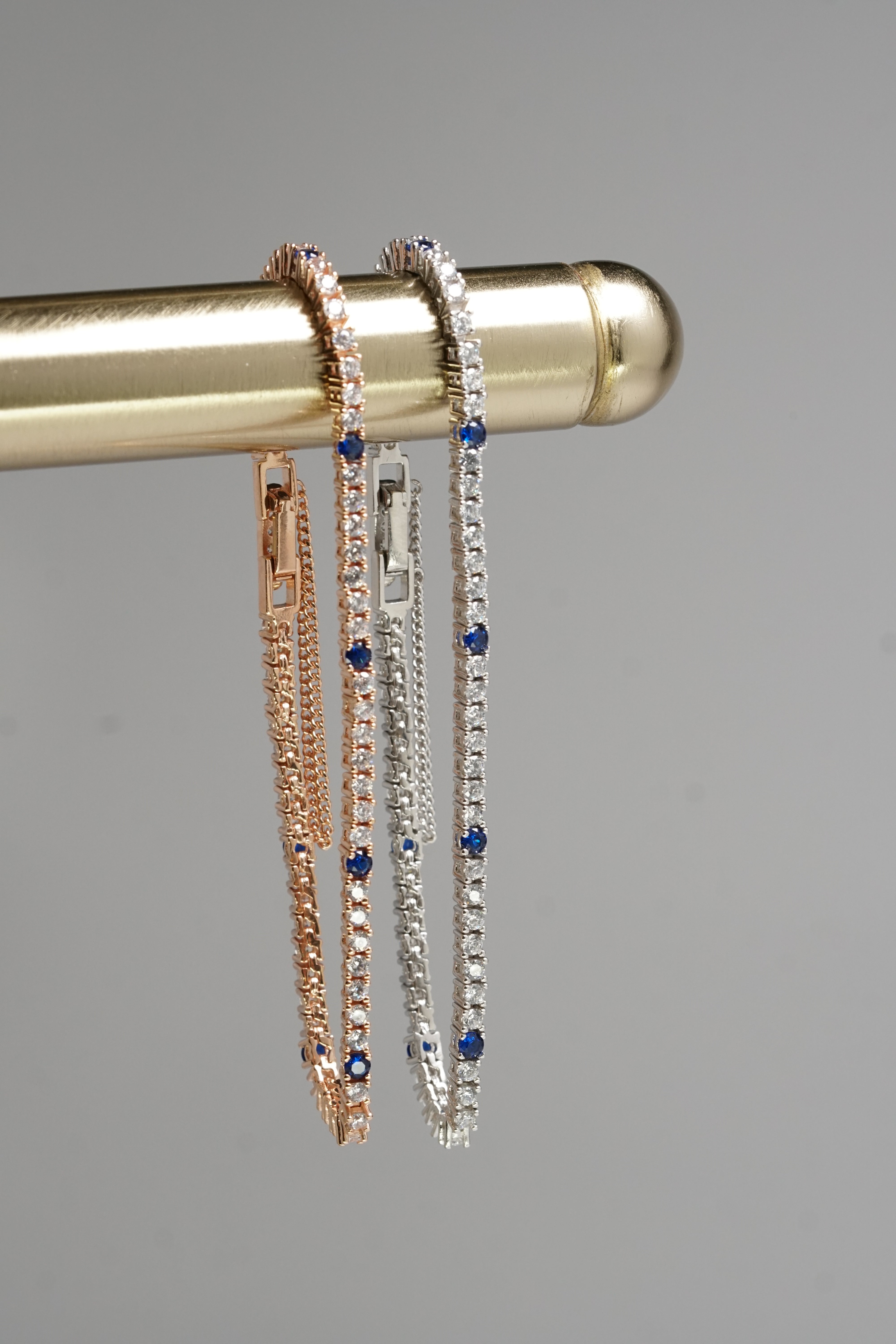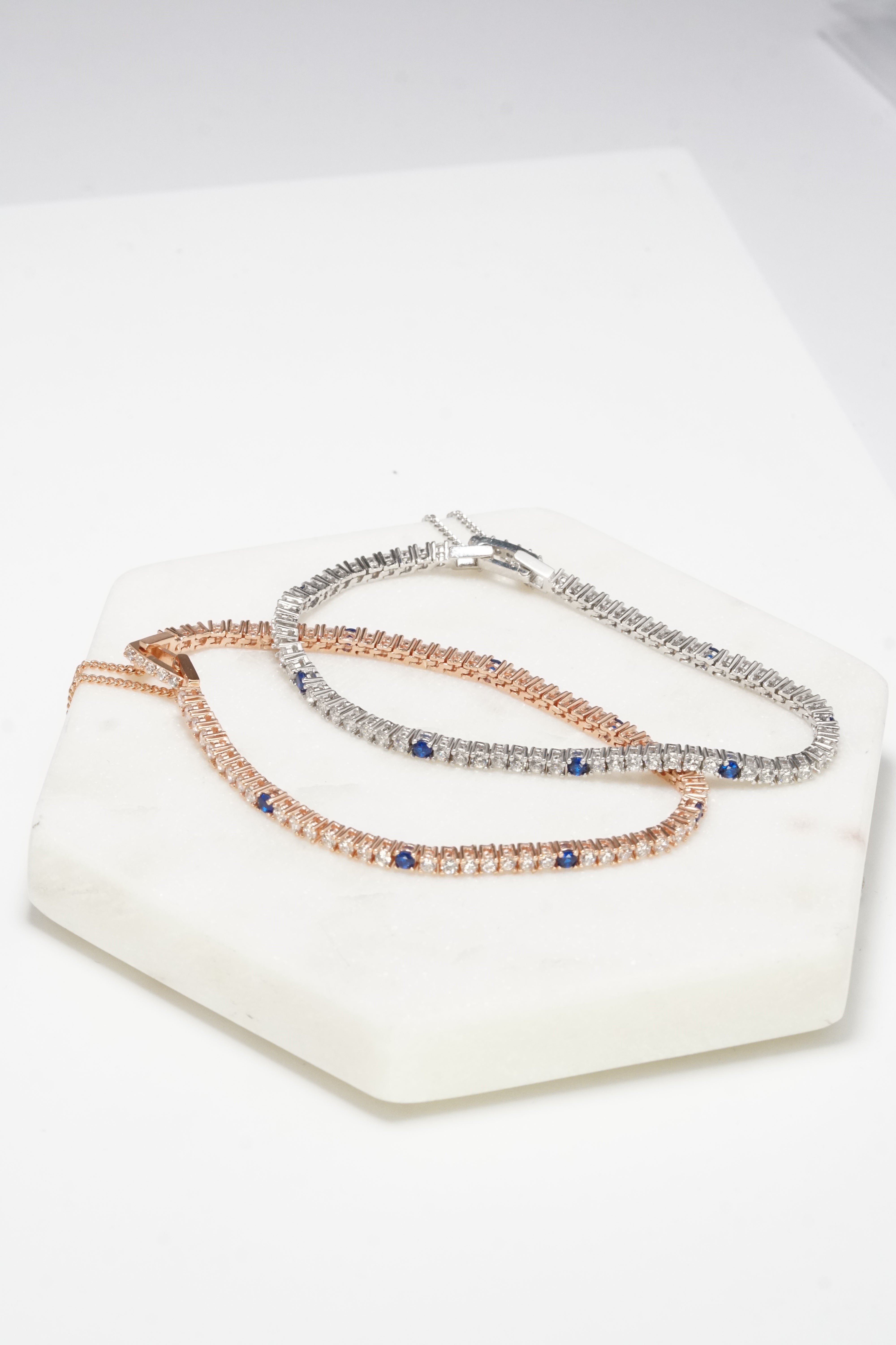 Introducing our 925 Sterling Silver 2.7mm Sapphire Accent Tennis Bracelet, a harmonious blend of classic sophistication and contemporary flair. Each bracelet features a series of meticulously set 2.7mm sapphire accents, offering a captivating sparkle that complements any outfit. Crafted from high-quality 925 sterling silver, this bracelet ensures durability and a lasting shine. The secure clasp provides a comfortable fit, making it suitable for all-day wear.
