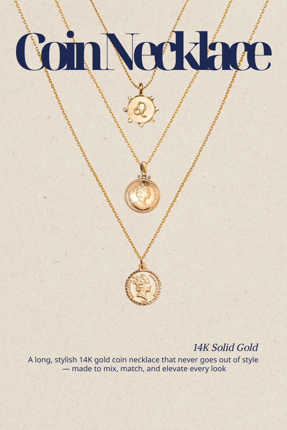 Crafted from genuine 14K solid gold, this series features three distinct coin pendant options and a curated selection of essential chain styles and lengths to create your perfect piece. Whether you choose a celestial horoscope pendant or one of two regal Queen Elizabeth coins, your necklace will shine with handcrafted beauty and meaningful elegance.